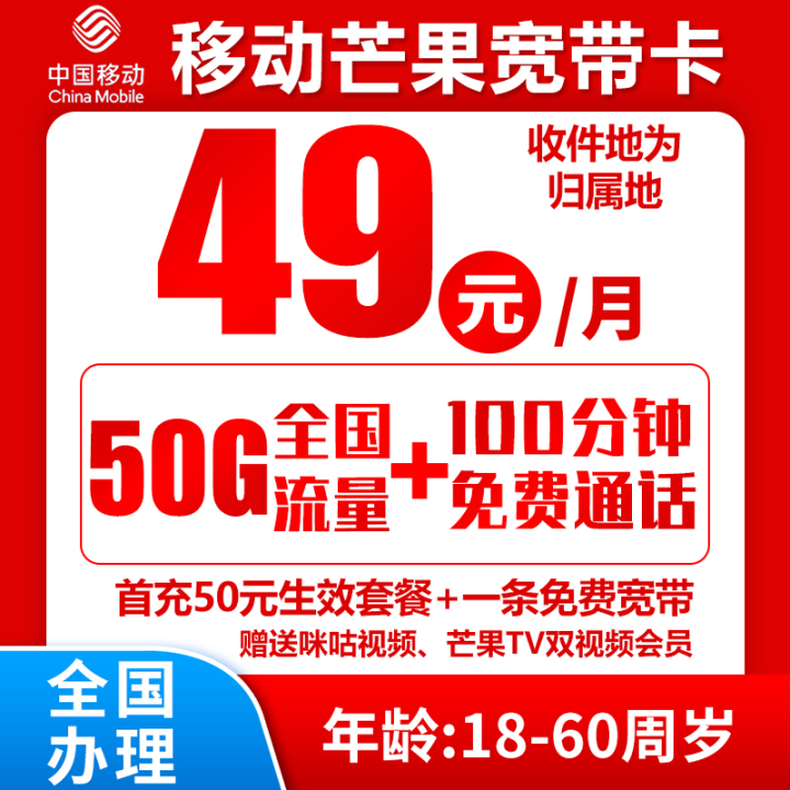 2025年最新移动芒果宽带卡:49元50G全国流量+100分钟通话,一条免费宽带